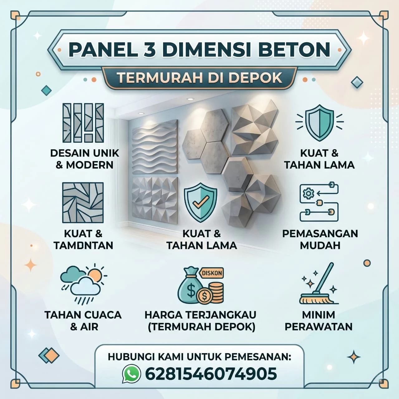 Dinding merupakan elemen interior dan eksterior yang memegang peranan krusial dalam estetika sebuah bangunan. Bagi Anda yang berdomisili di wilayah Bojongsari, Depok, kini hadir solusi dekorasi modern melalui Panel 3 Dimensi Beton. Material ini bukan sekadar penutup dinding biasa, melainkan elemen arsitektural yang mampu memberikan tekstur, kedalaman, dan karakter kuat pada hunian maupun tempat usaha Anda.