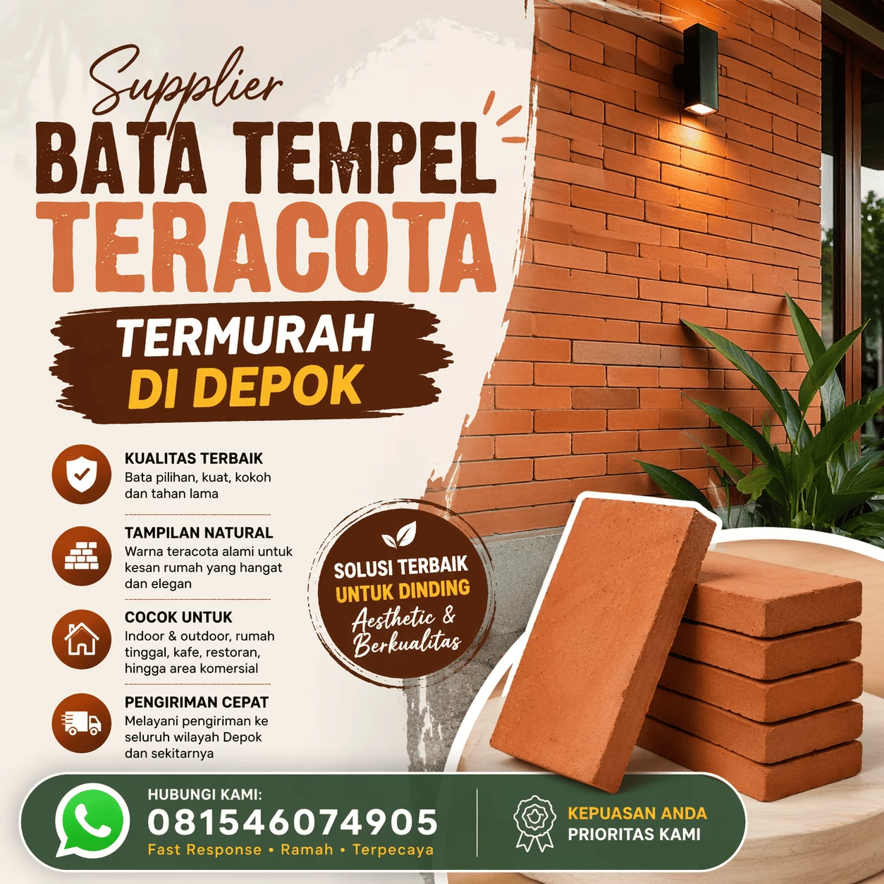 Kami adalah supplier terpercaya yang melayani kebutuhan bata tempel teracota untuk area Depok dan sekitarnya, dengan harga l