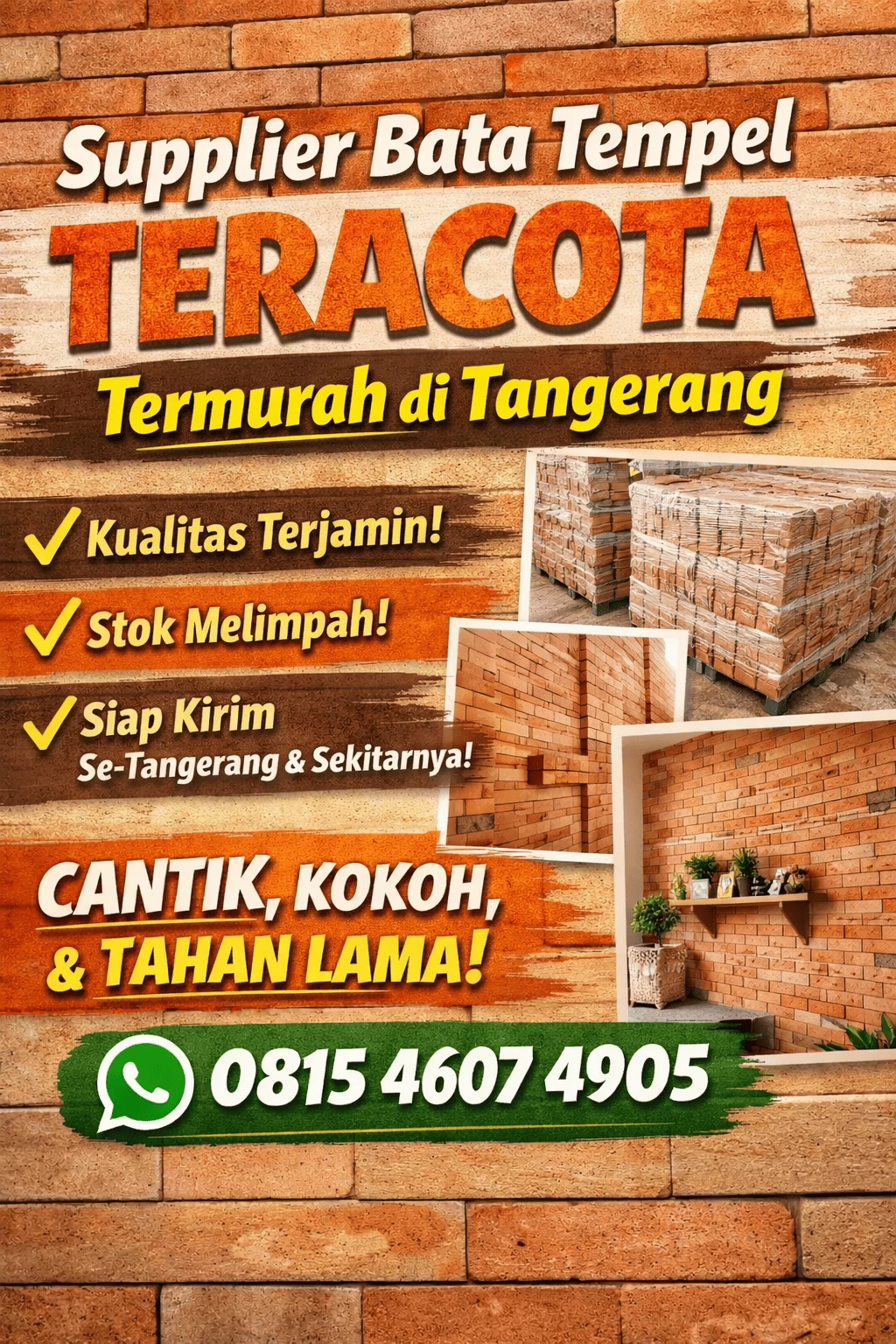 Kami adalah supplier terpercaya yang menyediakan bata tempel teracota berkualitas dengan stok lengkap, harga bersaing, dan pengiriman cepat ke seluruh wilayah Solear Tangerang. Dengan pengalaman melayani banyak pelanggan, kami memahami kebutuhan material bangunan yang kuat, estetik, dan bernilai tinggi.