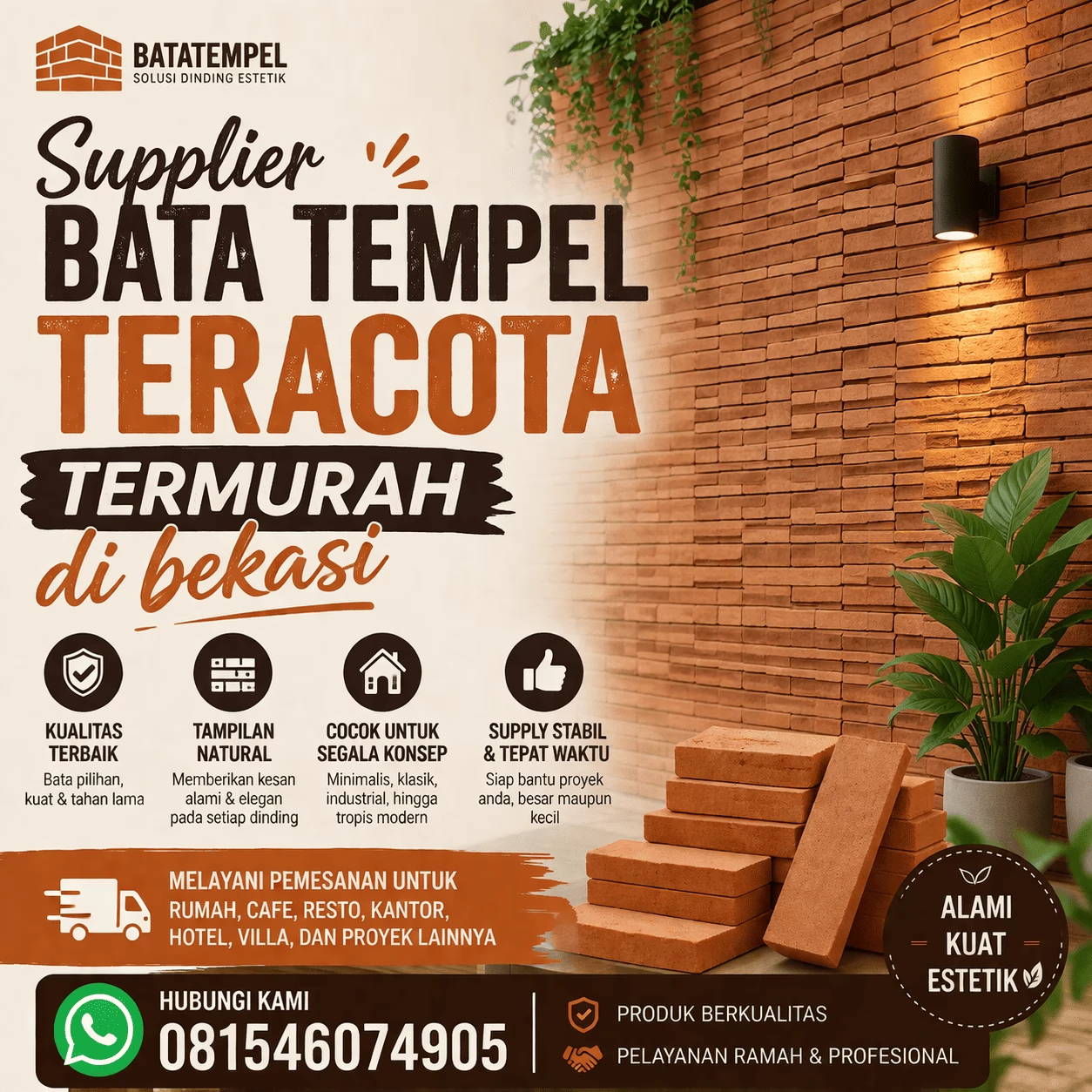 Kami adalah supplier terpercaya yang menyediakan bata tempel teracota berkualitas dengan stok lengkap, harga bersaing, dan pengiriman cepat ke seluruh wilayah Cibarusah Bekasi. Dengan pengalaman melayani banyak pelanggan, kami memahami kebutuhan material bangunan yang kuat, estetik, dan bernilai tinggi.